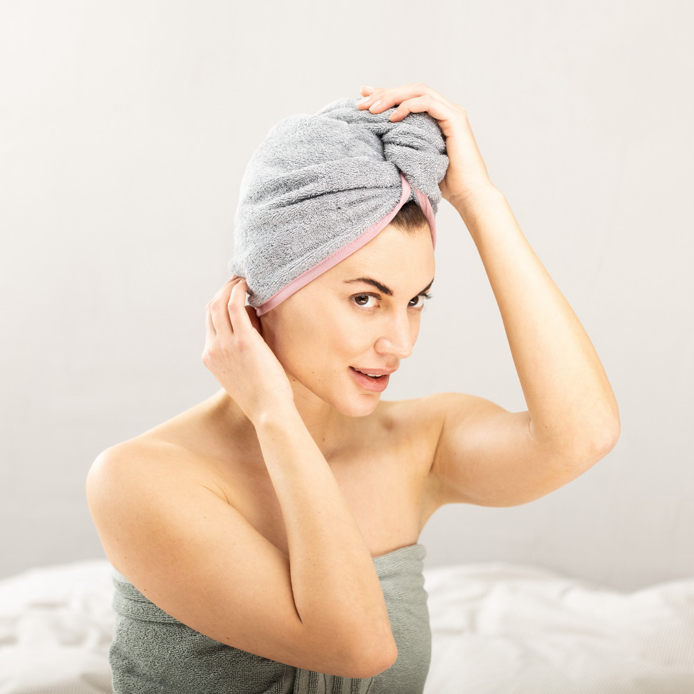 Sada 2 turbanů na domácí úrovni v kombinaci růžové a šedé barvy je ideální pro přidání barvy do vaší rutiny péče o vlasy. Tyto turbany vyrobené z organické bavlny jsou extrémně měkké a šetrné k pokožce, poskytují ochranu a pohodlí po celý den. Díky jejich univerzálnímu designu jsou vhodné pro všechny tvary hlavy a prodyšný materiál zabraňuje přehřívání pokožky hlavy.