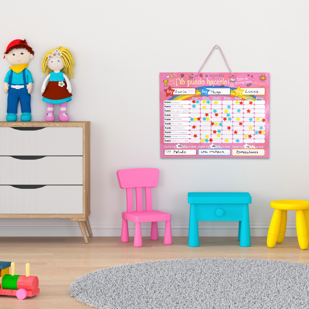 Podobně jako předchozí model je tato dětská nástěnka s odměnami/úkoly Navaris s 250 magnety a velikostí 40 x 32 cm dokonalým vzdělávacím nástrojem pro rozvoj organizačních schopností těch nejmenších. Zařízení je k dispozici ve španělštině, takže je ideální pro výuku jazyka nebo pro děti, které již tímto jazykem mluví. Každý úkol nebo odměnu lze přiřadit pomocí 250 barevných magnetů, které lze přizpůsobit podle aktivit dítěte.