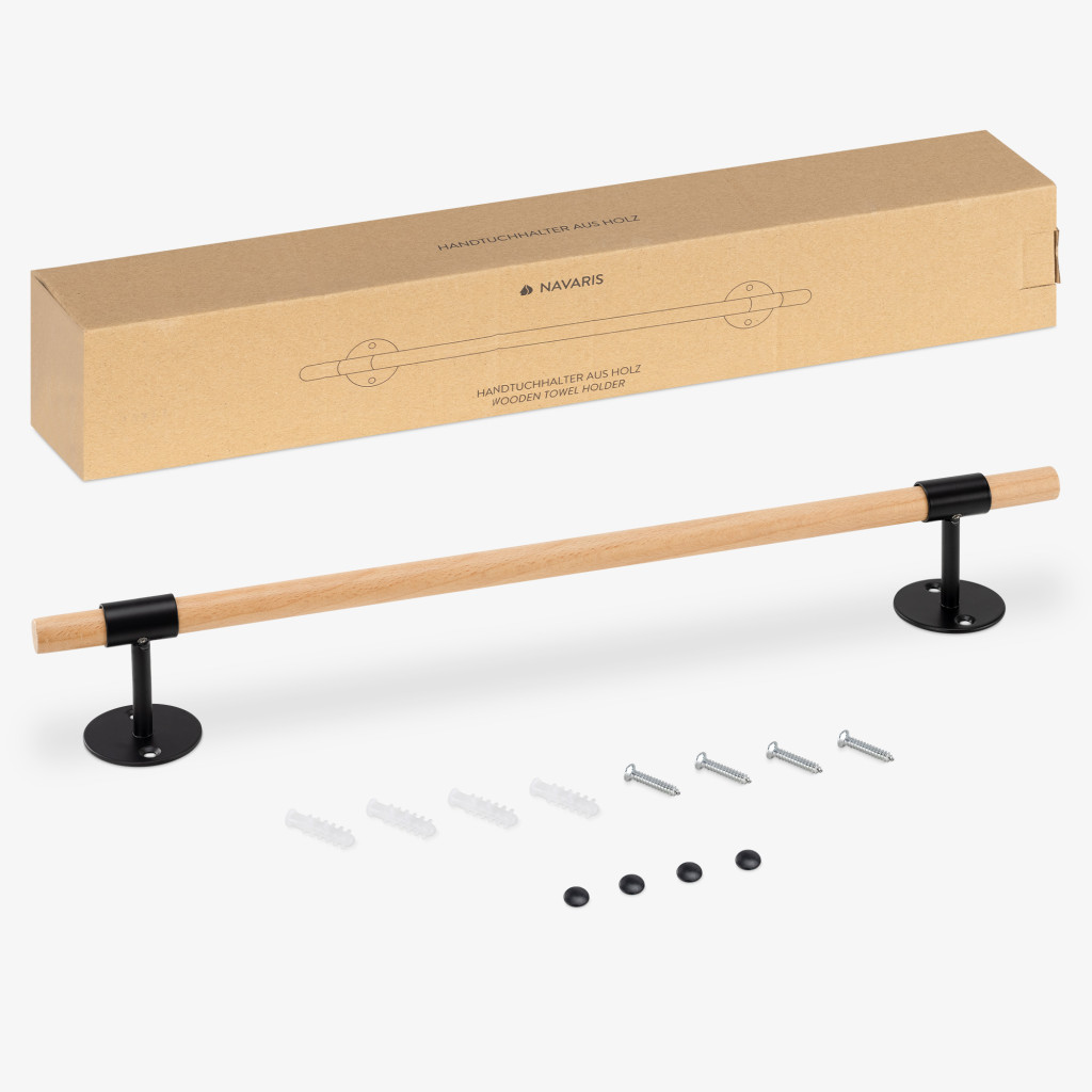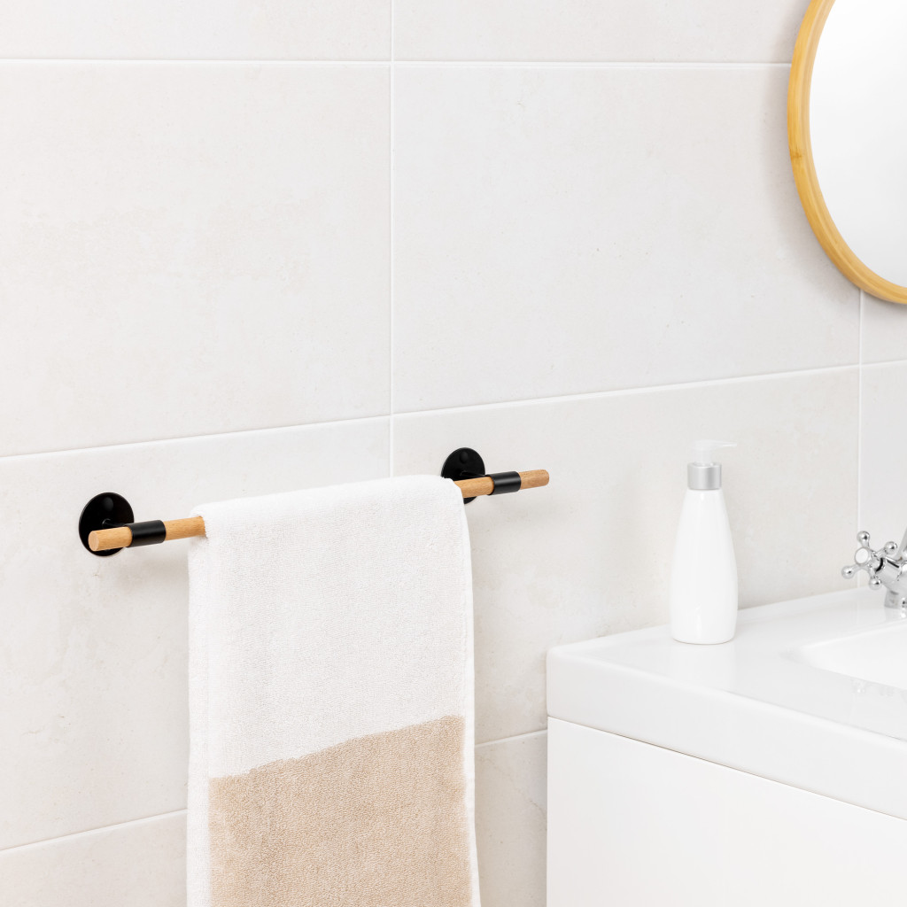 Suport prosop perete Navaris, 43.5x6.5x10 cm, montaj inclus, bambus si fier, maro/negru, bambus/fier