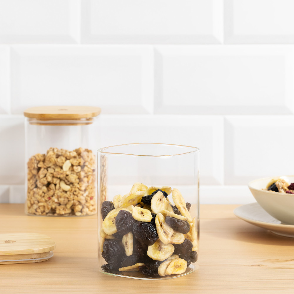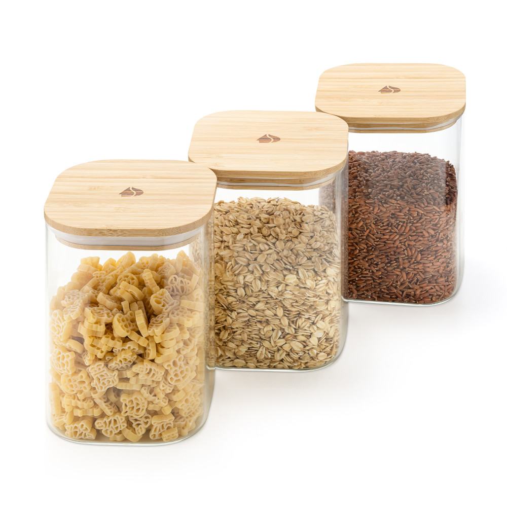 Skladujte potraviny stylově se sadou skleněných dóz Navaris. Díky stohovatelnému designu a bambusovým víkům používejte nádoby pro skladování suchého zboží, jako je káva, čaj, cukr, těstoviny, cereálie a další. Dřevěná víka těchto skladovacích nádob jsou utěsněna, aby potraviny zůstaly déle čerstvé.