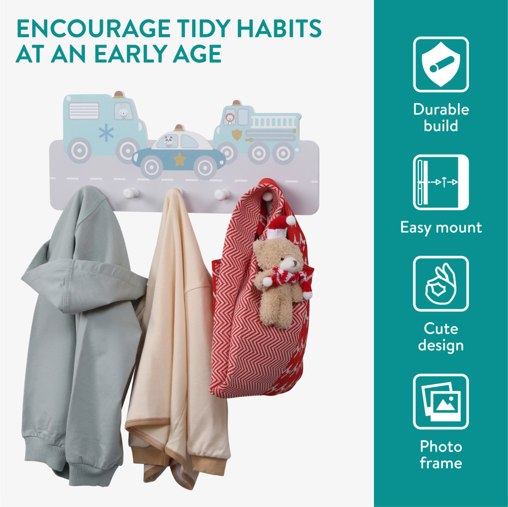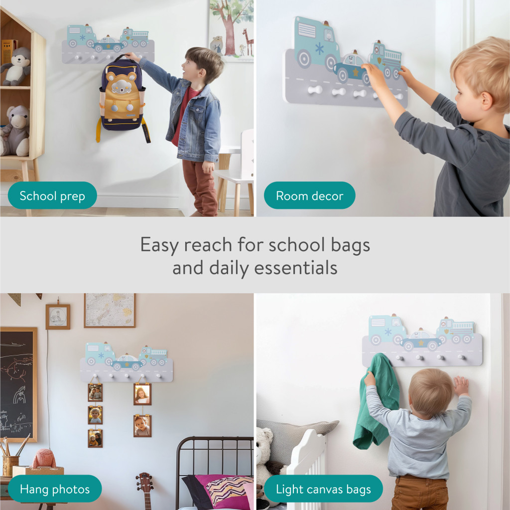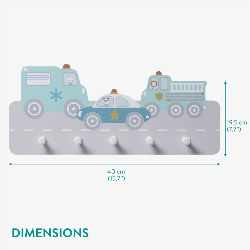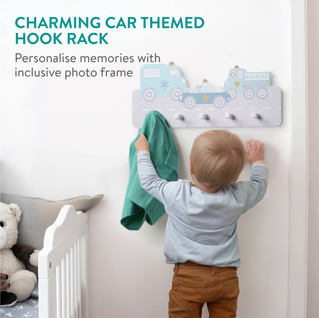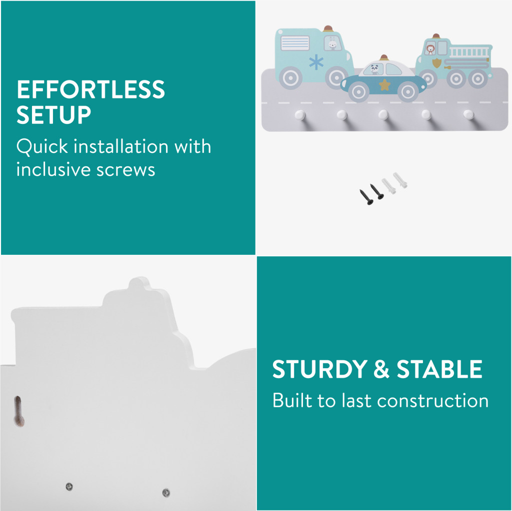 Cuier perete copii Navaris, tematica masini, 5 agatatori, 43x18.5x4 cm, multicolor, MDF