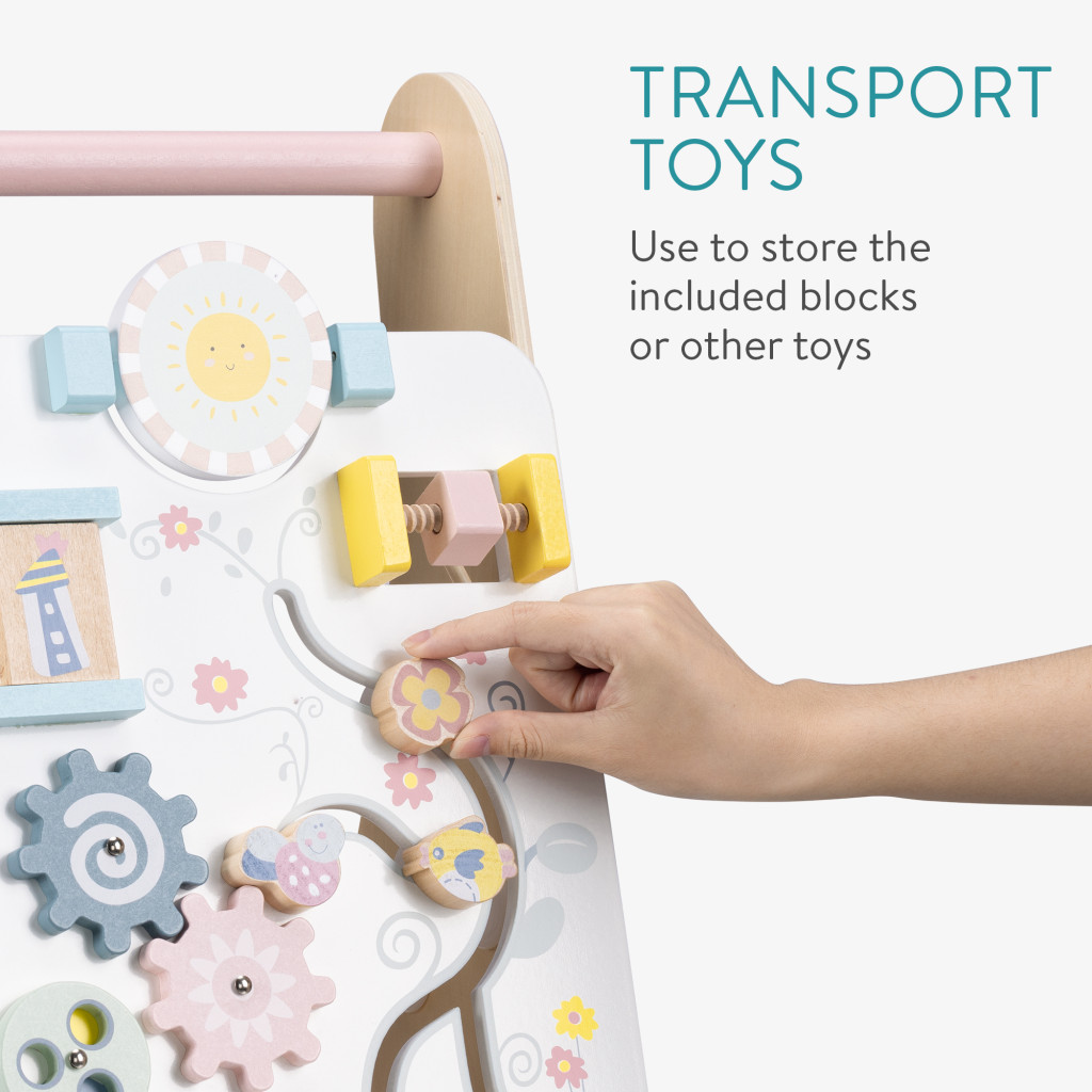 Mersulet din lemn Navaris, centru activitati, compartiment depozitare, roti cauciuc, bej, cauciuc/lemn