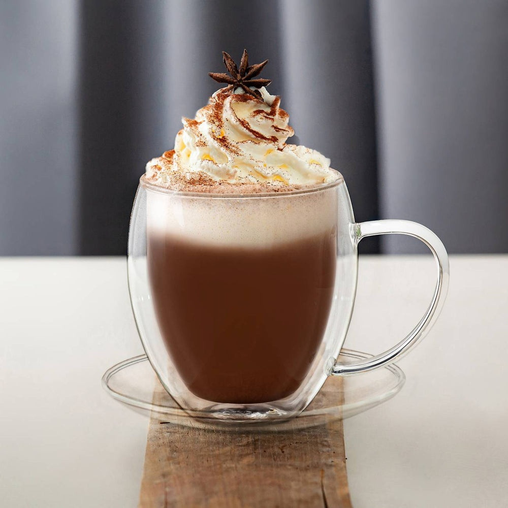 Cana termica XXL Creano, 400 ml, sticla borosilicata, perete dublu, cu farfurioara