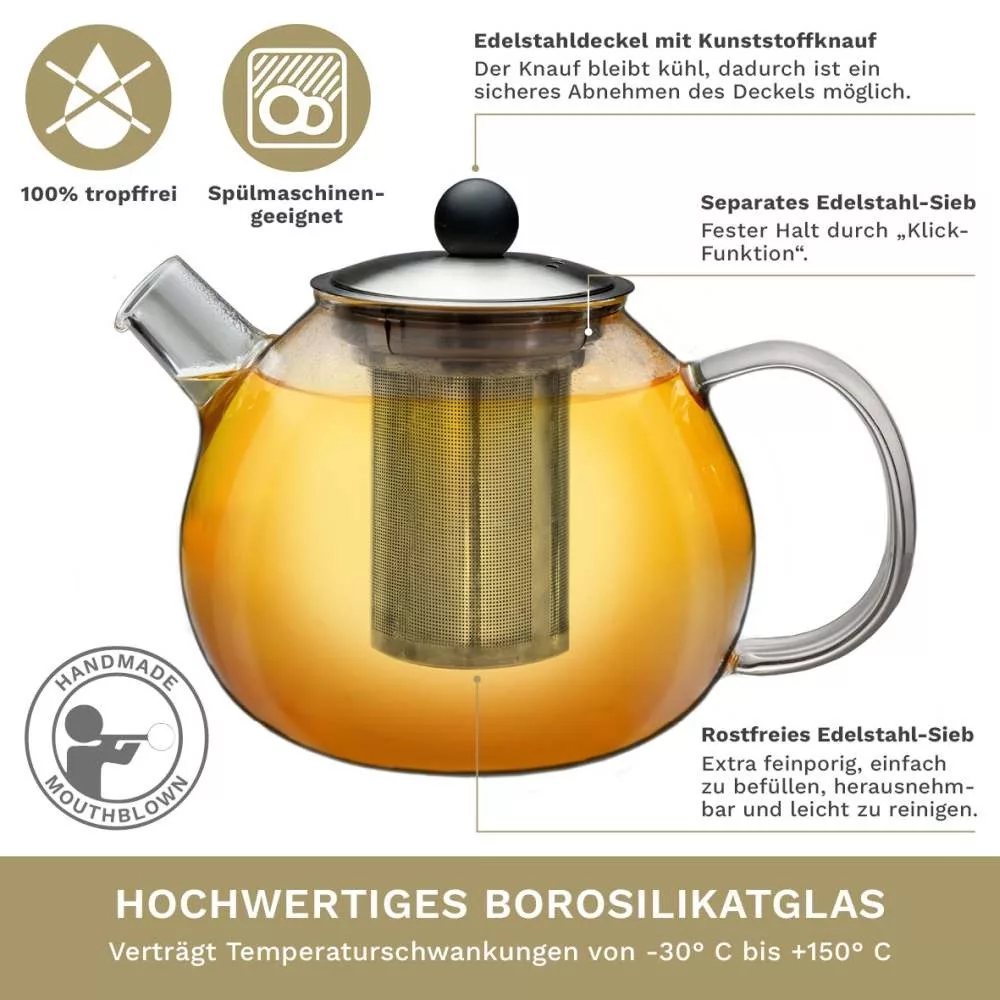 Ceainic din sticla Creano, 1,6 L, cu sita din inox si capac, pentru ceai vrac